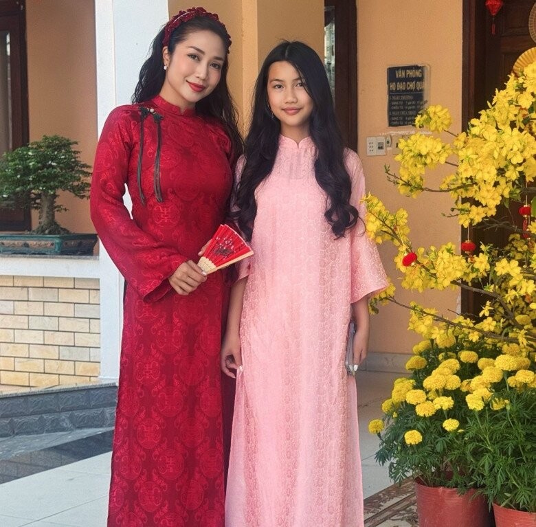 Cô nhóc theo mẹ Ốc Thanh Vân - mặc áo dài màu đỏ, sang chúc Tết bên ngoại, được khen ngợi xinh xắn, có sức hút rất đặc biệt.