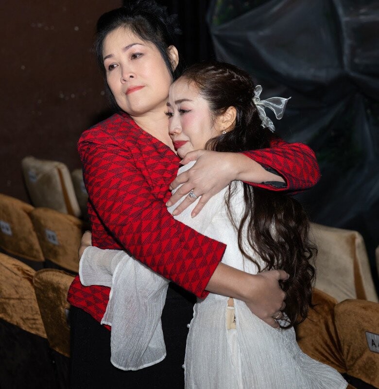 Khoảnh khắc nữ nghệ sĩ xúc động bật khóc, ôm lấy NSND Hồng Vân sau đêm diễn.