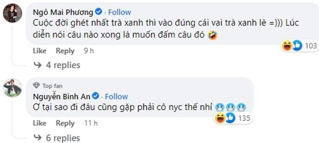 Về phía Bình An, anh chàng than thở thay cho nhân vật của mình: "Ơ tại sao đi đâu cũng gặp phải cô người yêu cũ thế này?". Sự tương tác qua lại trên MXH giữa các diễn viên gây thích thú không nhỏ cho công chúng.