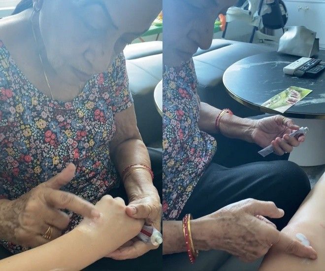 Kèm theo chia sẻ, nữ ca sĩ khoe đoạn clip đang được mẹ chồng Ấn Độ bôi thuốc muỗi. Được biết, Võ Hạ Trâm vừa tham gia một lớp học ngoại khoá và bị muỗi đốt rất nhiều. Không tự bôi thuốc, cô "tận dụng" sự có mặt của mẹ chồng để nhờ bà hỗ trợ. Trong khi con dâu thoải mái ngồi quay clip, mẹ chồng Ấn Độ của Võ Hạ Trâm cẩn thận thoa thuốc lên tay, lên chân cho cô. Hành động này lập tức thu hút sự quan tâm của cư dân mạng.
