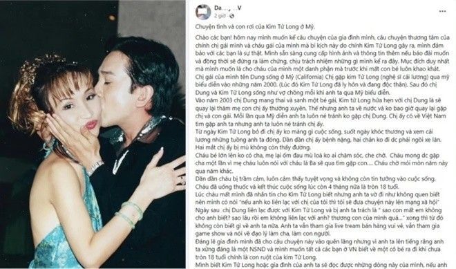 Thời gian qua, mạng xã hội không khỏi xôn xao khi một tài khoản có tên D.N.V đăng bài viết tố “ông hoàng cải lương” Kim Tử Long có con gái ở Mỹ nhưng không chịu trách nhiệm, khiến bé bị trầm cảm dẫn đến việc tự kết liễu đời mình. D.N.V còn khẳng định sẽ cung cấp thêm thông tin cho truyền thông và chịu trách nhiệm trước những lời mình nói.