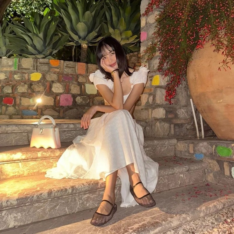 Lisa mang đến hình ảnh nữ tính pha chút vintage khi diện váy trắng nhẹ nhàng cùng giày búp bê lưới đen. Thiết kế xuyên thấu giúp tổng thể trở nên mềm mại, bay bổng hơn, đồng thời tạo điểm nhấn tinh tế, đúng với phong cách vừa ngọt ngào vừa cá tính của cô.