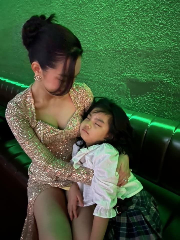 Bà mẹ 3 con vẫn nguyên bộ đồ quyến rũ còn đang mặc trên người, cô ôm con gái Tuệ An vào lòng vừa thương vừa buồn cười vì sự đáng yêu của cô bé. "Khi ánh đèn sân khấu tắt đi, 00:00" - nữ ca sĩ viết. Cô cho biết thêm chính bé Tuệ An đã xung phong đi nghe mẹ hát nhưng lại ngủ lúc nào không hay. "Hai chị xung phong theo mẹ đi làm bác ạ, mẹ hát muộn quá nên em tranh thủ ngủ 1 xíu mà gọi không dậy nổi luôn ạ" - Phạm Quỳnh Anh trò chuyện với một người thân.