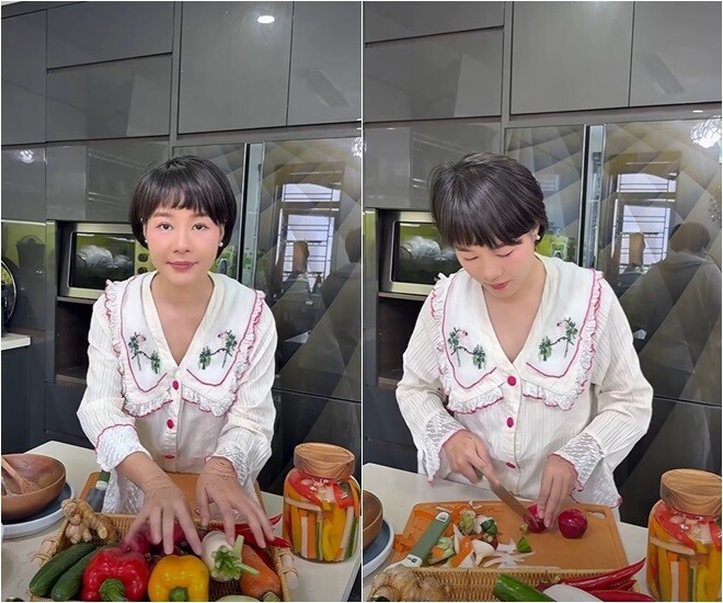 Song bà mẹ 2 con vẫn nỗ lực chứng mình mình có thể nấu ăn. Cô bày chiêu cho mọi người làm dưa muối cầu vồng. Diễn viên sinh năm 1990 cho biết cô rất thích muối dưa, làm dưa góp để làm đồ ăn kèm cho đỡ ngấy. Người đẹp cho hay: "Khi mình biết cách muối, nó sẽ là nguồn thực phẩm rất là dồi dào probiotic, nó lợi khuẩn còn xịn hơn cả sữa chua cơ".