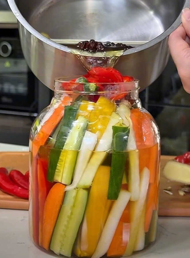 Cô xếp rau củ quả vào hũ thủy tinh, đổ nước vào và ngâm từ sáng đến chiều là đã có thể thưởng thức. Món dưa góp chua chua ngọt ngọt, giòn sần sật làm cả nhà khoái chí.