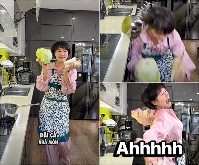 Cô hài hước: "Với một số loại cứng đầu như là cà rốt, củ cải, su hào thì sẽ phải xóc qua với muối khoảng 20 phút. Còn những loại yếu ớt như ớt chuông, dưa chuột thì không cần đâu. Chúng ta xóc đều lên, xóc cao lên, xóc mạnh tay vào để cho nó... sĩ thôi, chứ còn để im thì muối nó cũng tự tan. Cho người ta biết mình biết nấu ăn (Cười)".