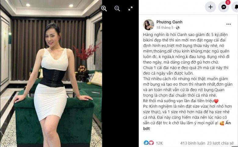 Sau khi giảm được 5 kí, cô nhấn mạnh việc mình đẹp lên là nhờ đeo đai latex. "Chưa 1 cái đai nào em đeo quá 2 giờ mà cái này thì đeo cả ngày vẫn được luôn.Thử nhiều cách rồi nhưng nói thật: muốn giảm mỡ bụng và tạo eo thon thì nhanh nhất, đơn giản và an toàn nhất vẫn cứ là đeo nịt bụng." - nữ diễn viên chia sẻ.