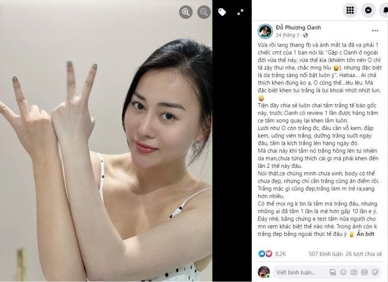 Không chỉ vóc dáng, Phương Oanh còn có lần PR sản phẩm... tắm trắng nhưng lại tiếp tục có gì đó cần phải bàn luận ở đây.