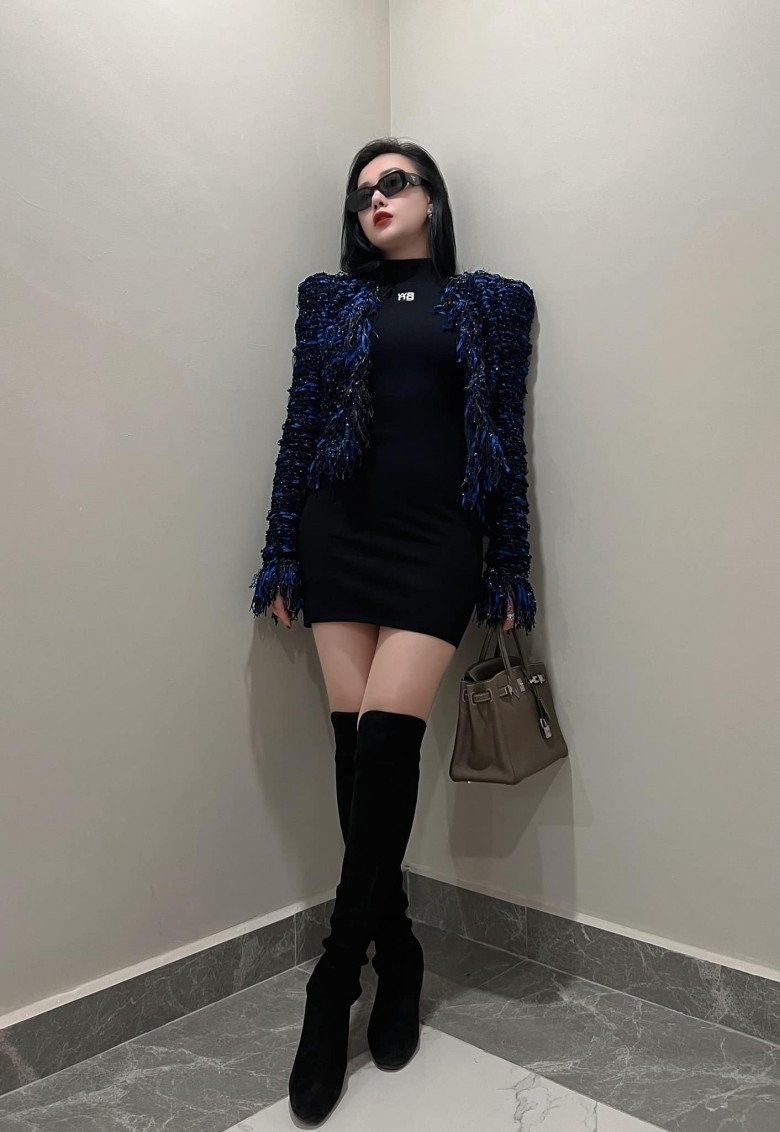 Quỳnh Búp Bê diện một bộ trang phục năng động với áo hoodie trẻ trung. Mỹ nhân sinh năm 1989 diện cùng chiếc váy ngắn cũn, khoe đôi chân thon. Chiếc túi Chanel Boy Flap Bag phiên bản giới hạn, trị giá trên dưới 5 nghìn đô được Phương Oanh trưng dụng, toát lên khí chất "tổng tài".