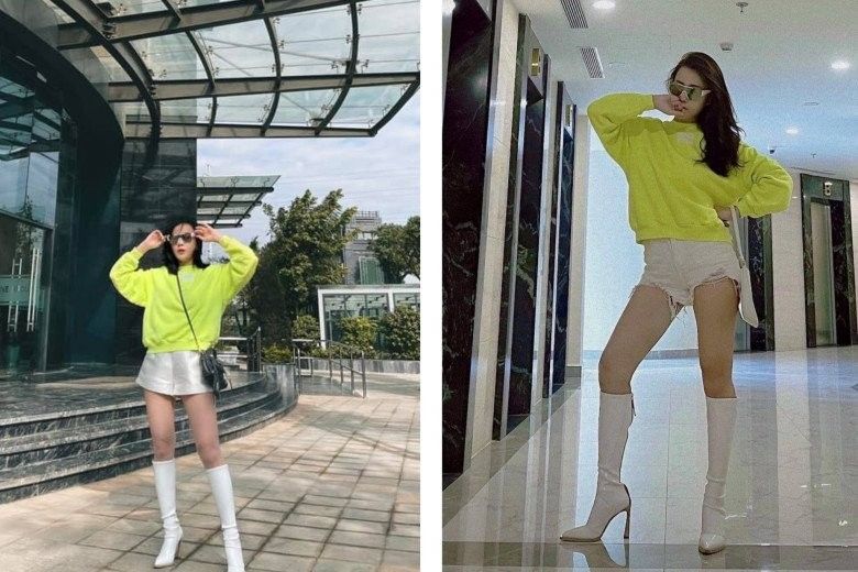 Không chỉ riêng trong mùa Hè mà chiếc quần short ngắn cũn còn cùng Phương Oanh ra phố trong mùa Đông. Để phù hợp hơn với thời tiết se lạnh, áo sweater và boots chính là mảnh ghép hoàn hảo giúp nữ diễn viên vừa trông thời thượng vừa giữ ấm cơ thể.