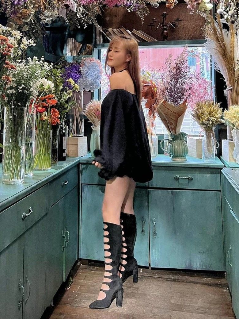 Phương Oanh cũng chuộng mốt giấu quần trẻ trung và bổ sung điểm nhấn bằng đôi boots cổ cao cut-out tiệp màu.