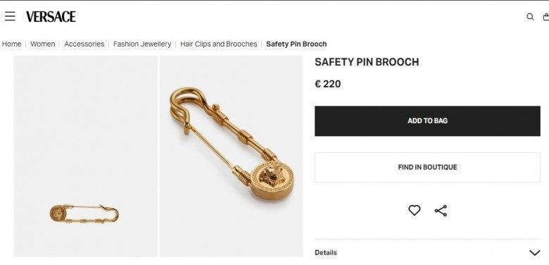 Chiếc ghim áo này có tên Safety Pin Brooch thuộc bộ sưu tập phụ kiện thời trang mang tên Safety Pin. Nó có giá khoảng gần 6 triệu đồng.