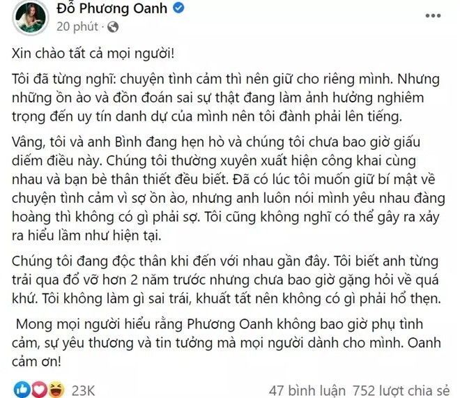 Trước phản ứng của khán giả, Phương Oanh và Shark Bình đều lên tiếng xác nhận chuyện hẹn hò. Nữ diễn viên Quỳnh Búp Bê nói: "Tôi và anh Bình đang hẹn hò và chúng tôi chưa bao giờ giấu giếm điều này. Chúng tôi thường xuyên xuất hiện công khai cùng nhau và bạn bè thân thiết đều biết. Chúng tôi đang độc thân khi đến với nhau gần đây. Tôi biết anh từng trải qua đổ vỡ hơn 2 năm trước nhưng chưa bao giờ gặng hỏi về quá khứ. Tôi không làm gì sai trái, khuất tất nên không có gì phải hổ thẹn".