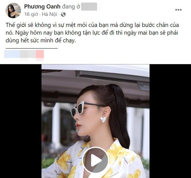 Ít giờ trước, Phương Oanh có một bài đăng mới trên trang cá nhân, ẩn ý nói đến sự mệt mỏi. Nữ diễn viên viết: "Thế giới sẽ không vì sự mệt mỏi của bạn mà dừng lại bước chân của nó. Ngày hôm nay bạn không tận lực để đi thì ngày mai bạn sẽ phải dùng hết sức mình để chạy".