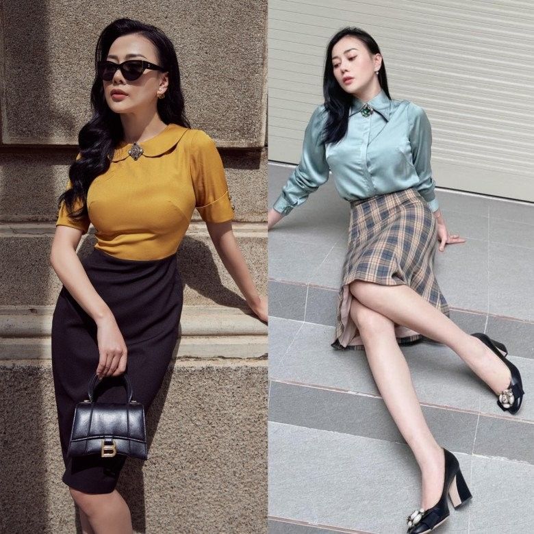 Phương Oanh thời gian gần đây chuyển định hướng sang kinh doanh thời trang, tạm gác việc đóng phim. Cô hướng đến style công sở với công thức phối đồ đậm chất Thư ký Kim là chân váy bút chì với áo blouse. Lần xuống phố này, cô ăn mặc làm người xem gợi nhớ đến Nam "nọng" của Hương Vị Tình Thân nhưng đồng thời cũng nhắc đến dấu ấn của Shark Bình ở đâu đây!