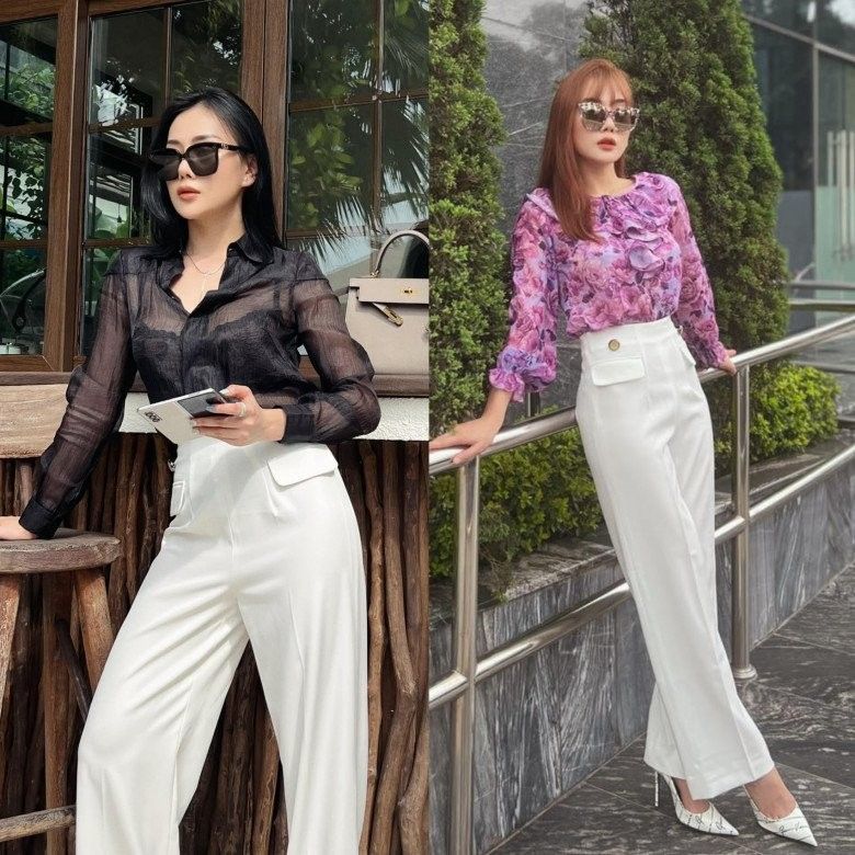 Không biết bây giờ có còn ai mặc đi làm kiểu áo xuyên thấu để lộ áo bralette ren đã là mốt của 3-4 năm trước? Hay có quý cô thành thị nào mặc áo bèo nhún hoạ tiết hoa nền tím có phần "bánh bèo" thế kia đi làm?