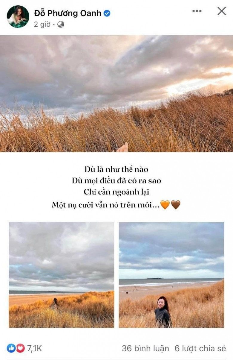 Vài giờ trước, tài khoản có nhân của Phương Oanh tiếp tục gây chú ý khi đăng tải 3 bức hình khoe nhan sắc xinh đẹp kèm theo đó là dòng status động viên bản thân trước thềm năm mới: "Dù là như thế nào. Dù mọi điều đã có ra sao. Chỉ cần ngoảnh lại. Một nụ cười vẫn nở trên môi".