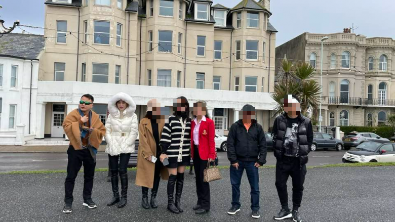 Shark Bình và Phương Oanh đứng cạnh nhau trong chuyến du lịch Châu Âu, bên cạnh còn có rất đông bạn bè người thân.