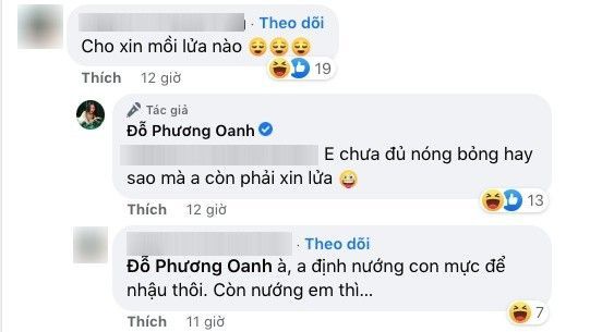 Dưới bài đăng, Phương Oanh nhận được rất nhiều lời yêu thương từ người thân, bạn bè. Trong đó, có người đã bình luận: “Cho xin mồi lửa nào”. Nữ diễn viên lập tức "thả thính" lại: “Em chưa đủ nóng bỏng hay sao mà anh còn phải xin lửa?”. Trước câu trả lời của nữ diễn viên, người này tỏ ra bối rối: “À, anh định nướng con mực để nhậu thôi. Còn nướng em thì…”.