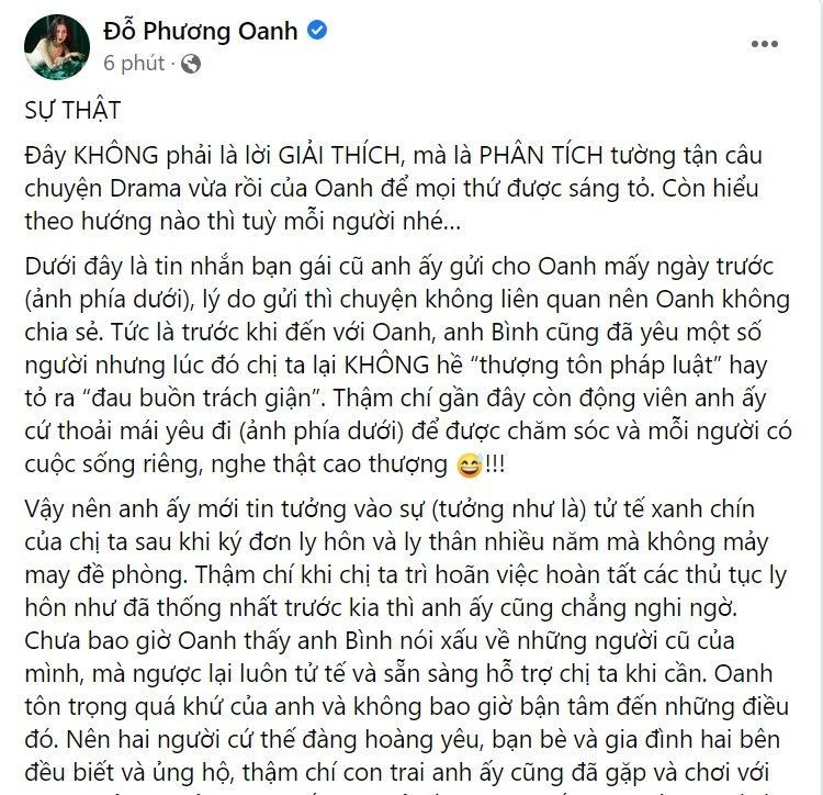 Phương Oanh đăng tin "sốc" lúc nửa đêm, khẳng định những điều được cô cho là "sự thật" đằng sau ồn ào tình cảm.