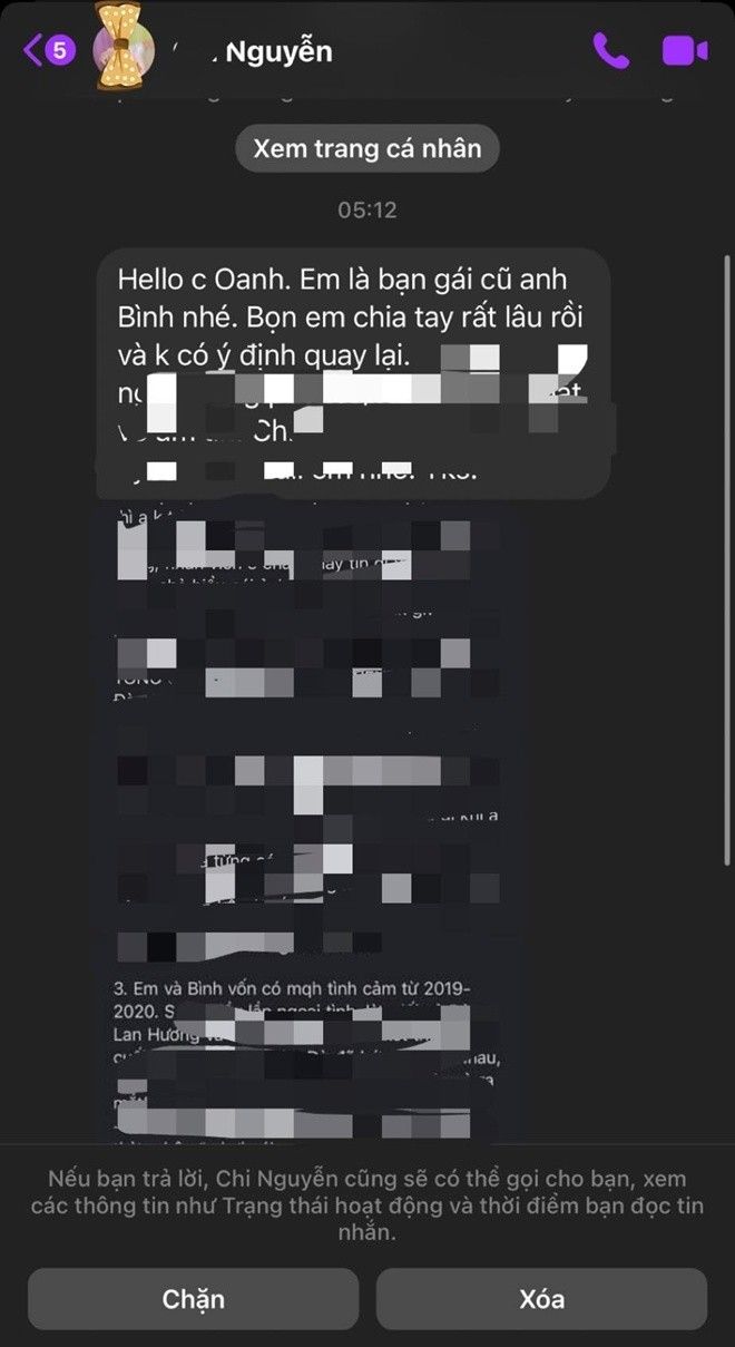 Phương Oanh tung một đoạn tin nhắn mà cô khẳng định là "bạn gái cũ của Shark Bình" gửi cho mình từ nhiều ngày trước. Theo đó, trước khi đến với Phương Oanh, "cá mập" cũng có một vài bóng hồng khác, nhưng nữ doanh nhân Đào Lan Hương không hề tuyên bố "thượng tôn pháp luật" hay tỏ ra "đau buồn trách giận" như trong trường hợp của cô.