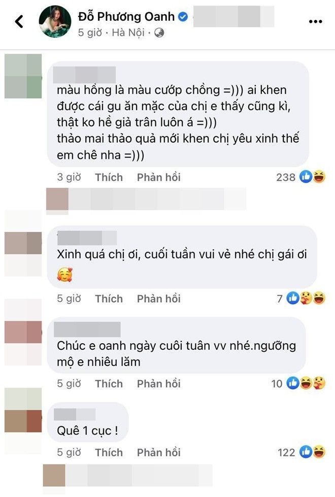 Thế nhưng phía dưới bài viết, đông đảo cư dân mạng lại dành cho Phương Oanh những lời bình luận chửi mắng. “Màu hồng là màu cướp chồng. Ai khen được cái gu ăn mặc của chị em thấy cũng kì. Thật không hề giả trân luôn á. Thảo mai thảo quả mới khen chị yêu xinh thế. Em chê nha”, “Công nhận gu của Oanh phèn thật đấy. Nhìn không khác gì bà đi dọn cỏ”, “Chủ nhật vào hóng cả cõi mạng chửi Oanh vui, giải trí dã man”... Đứng trước những comment ném đá, chê bai của khán giả thì Phương Oanh bất ngờ giữ im lặng, không còn “máu chiến” như trước.