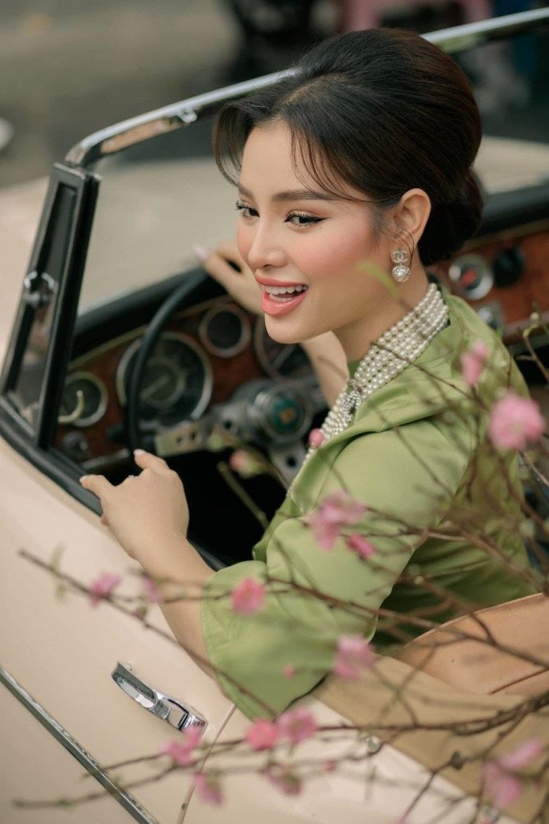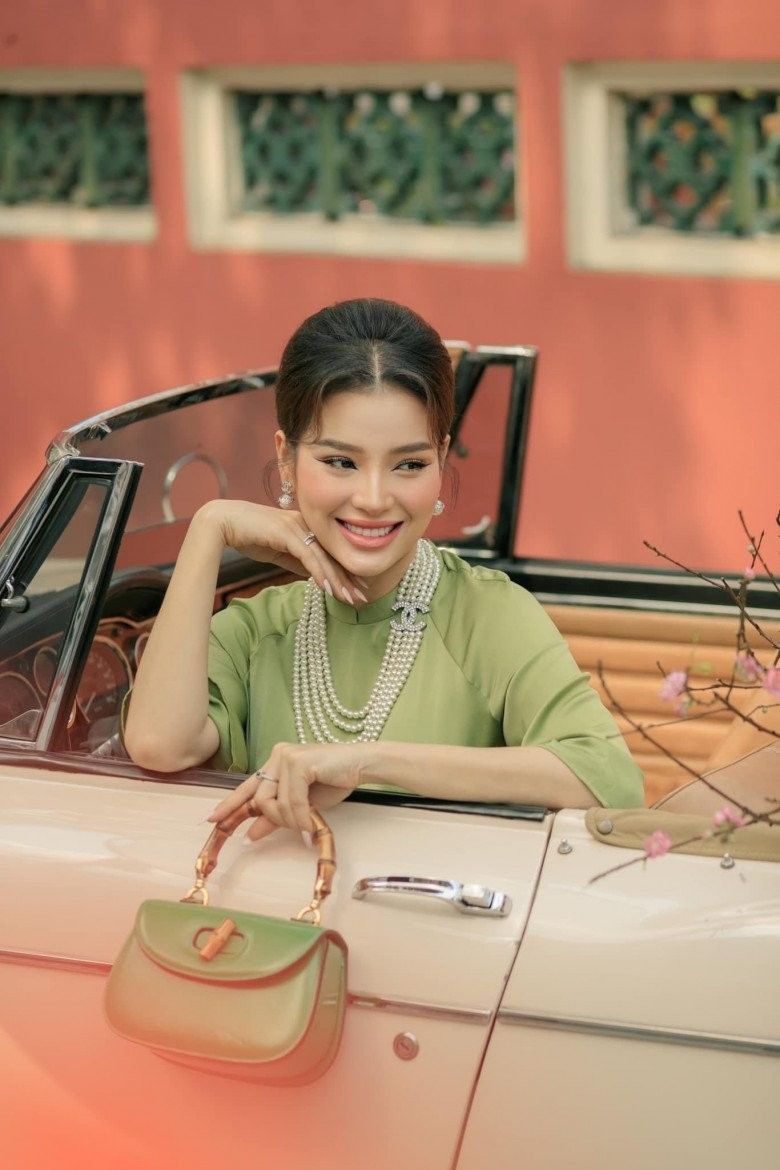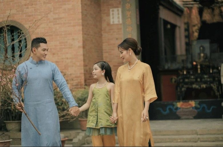 Phương Trinh nở nụ cười tươi tắn và rạng ngời khi diện áo dài du Xuân, cô còn khéo léo che được chiếc bụng bầu nhờ lựa chọn trang phục áo dài truyền thống. Bà mẹ xinh đẹp còn phối cùng túi xách Gucci thời thượng và đồng điệu để nâng tầm set đồ và tổng thể tuyệt vời hơn.