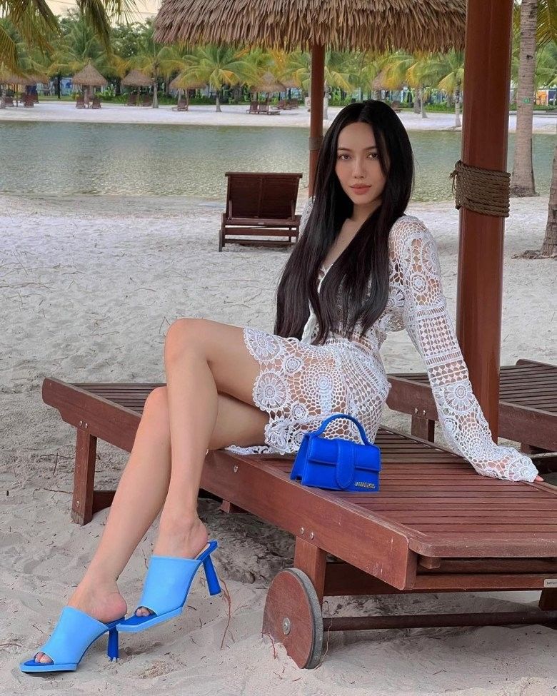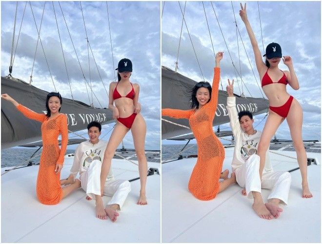 Trong khi Ngọc Trinh khoe dáng triệt kể với bikini 2 mảnh quen thuộc, Diệu Nhi lại nổi bần bật với bikini cạp cao tôn eo thon gọn và áo lưới khoác ngoài nửa kín nửa hở.