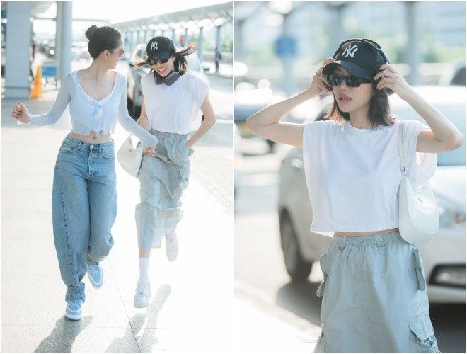 Thời trang sân bay của Diệu Nhi trước đó một ngày cũng đủ sức "chặt đẹp" cô chị về độ sành điệu. Bà xã Anh tú chọn áo croptop độn vai cùng chân váy dài lạ mắt, kết hợp thêm rất nhiều phụ kiện cá tính, năng động.