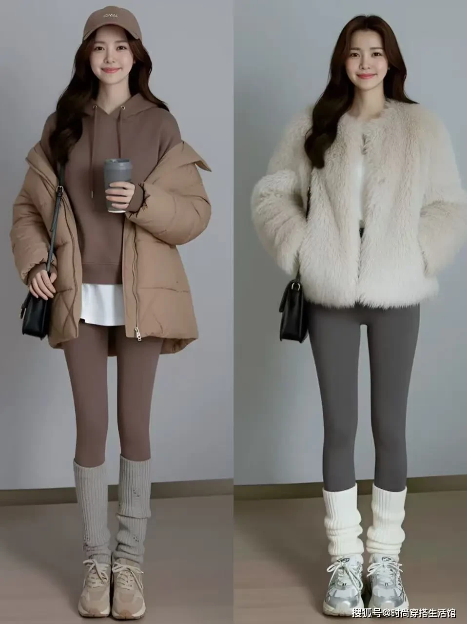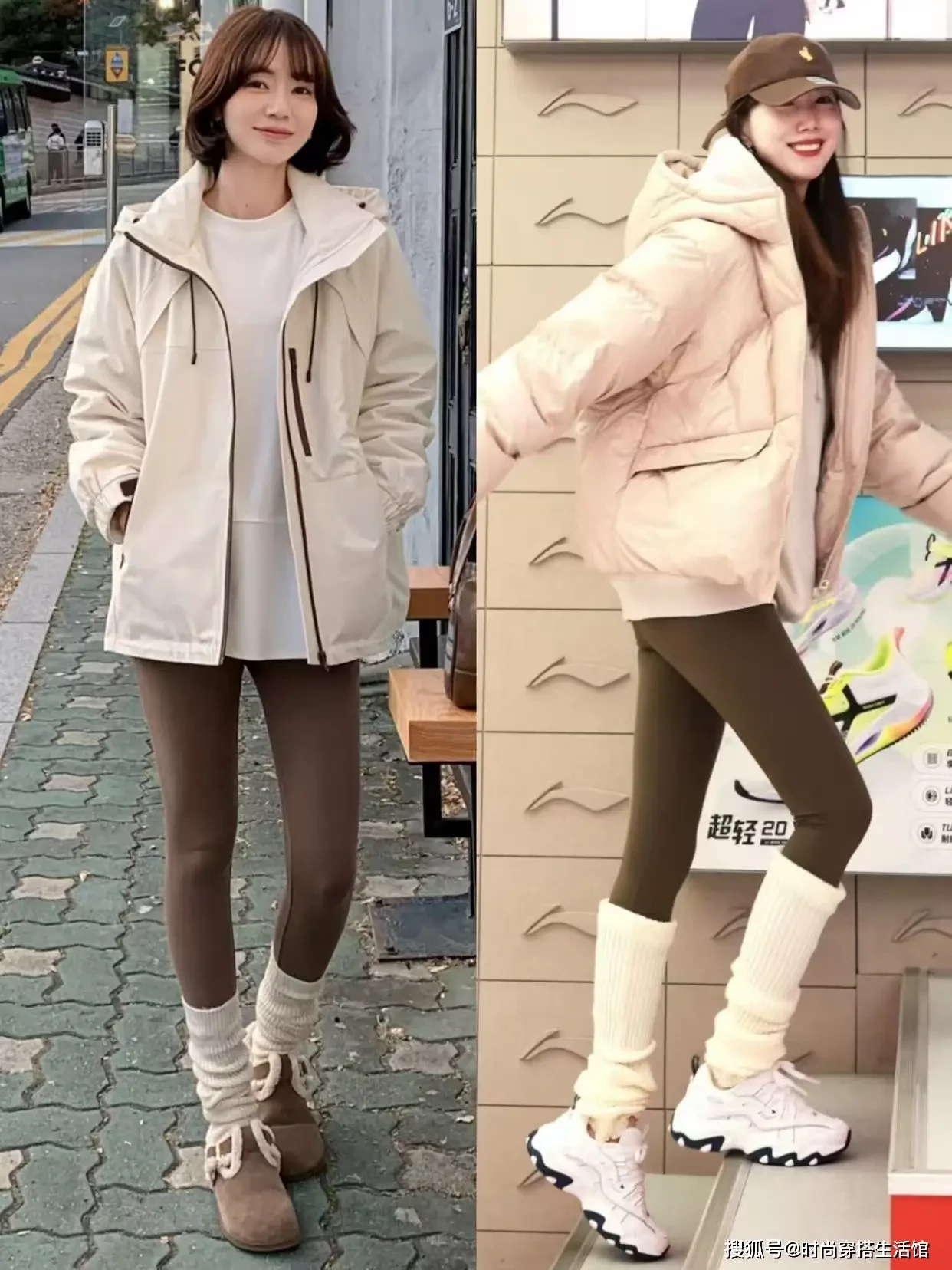 Trong điều kiện nhiệt độ xuống dưới 0°C, bạn có thể áp dụng công thức áo khoác gió hoặc áo khoác phao chống gió + áo len + quần legging + tất trắng + giày đi tuyết. Quần legging mặc bên trong các lớp trang phục rộng rãi vẫn giữ được sự gọn gàng cho đôi chân, không gây cảm giác cồng kềnh. Ngay cả khi nhiệt độ xuống dưới -10°C, cách phối này vẫn đảm bảo ấm áp và thoải mái khi di chuyển.