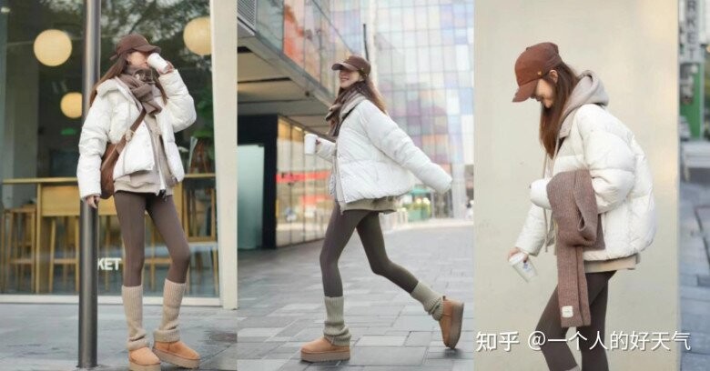 Phong cách Maillard với bảng màu nâu – trắng đang cực kỳ được ưa chuộng. Gợi ý hoàn hảo là áo khoác phao trắng + quần legging màu nâu + tất ống rộng tông nâu + giày lót lông cừu. Sự kết hợp này không chỉ giữ ấm tốt mà còn “ăn gian” chiều cao, giúp đôi chân trông dài và thon hơn. Đây là lựa chọn lý tưởng cho những ngày đông lạnh nhưng vẫn muốn giữ vẻ ngoài thời trang.