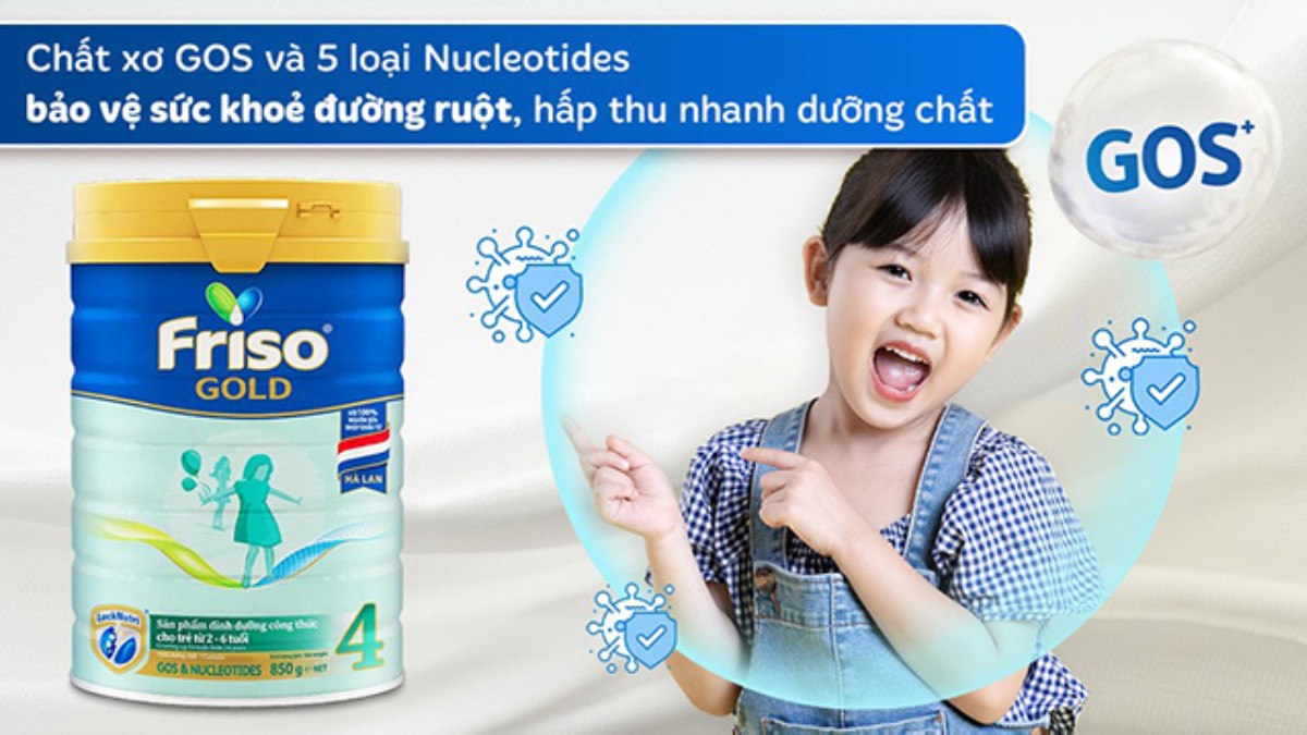 Friso Gold 4 dành cho trẻ từ 2-6 tuổi với GOS và 5 loại Nucleotides giúp bảo vệ sức khoẻ đường ruột