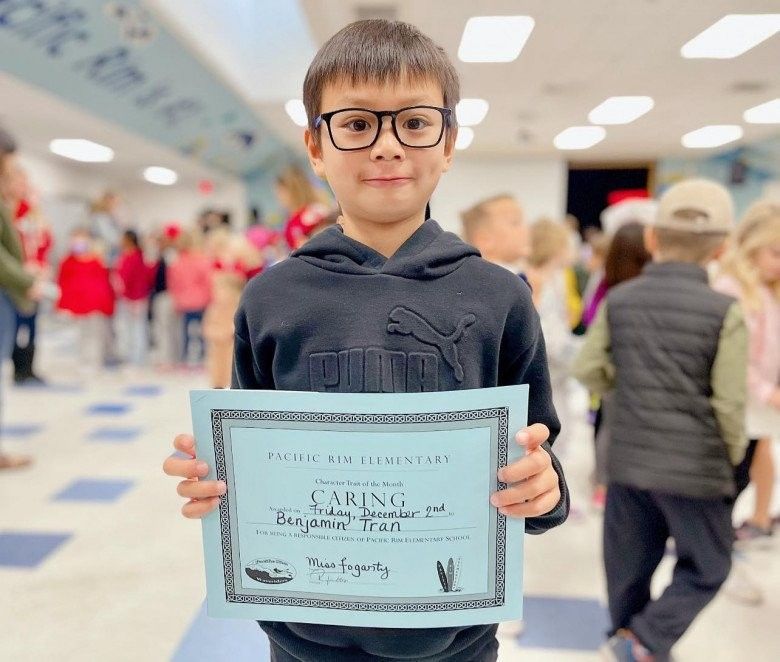 Hôm đó đi học về con tâm sự là Bung có linh cảm Bung sẽ nhận được giải thưởng bố mẹ ạ, vì khi cô thông báo có 4 bạn nhận giải thì cô cứ nhìn con cô cười. Đâu đâu, cô cười thế nào diễn tả lại bố mẹ xem nào? À chắc là cô cười vì tóc Bung dài quá mà không chịu cắt đấy. À nhưng cứ hy vọng nhờ, các con cứ chăm học thì biết đâu bất ngờ... Tèn ten… Và đây là em Cà Bung Benjamin của nhà ta đó các bác ơi. Ai thưởng gì cứ thưởng, mẹ con xin nhận online ạ”.