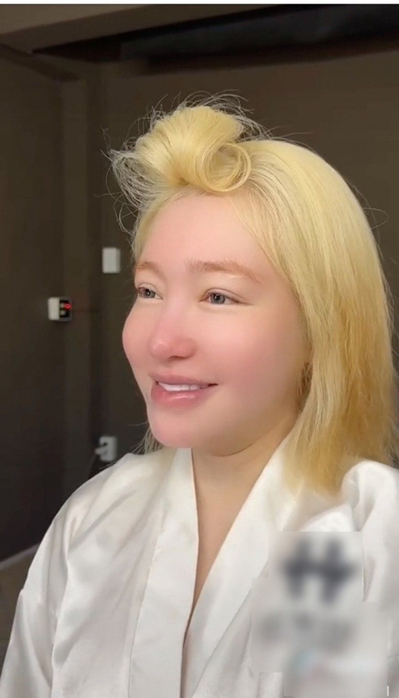 Theo đó, bà mẹ 2 con cho biết khi nâng tông màu tóc, cô cũng phải tẩy nhuộm luôn cặp chân mày. Cô dí dỏm cho rằng, tóc màu sáng mà chân mày màu đen trông sẽ rất lệch lạc. Trong video người đẹp quay ở góc cận ở tư thế đang nằm nên có thể gương mặt trông phúng phính hơn cả. Làn da trắng sứ của cô nàng dường như phát sáng tới ghen tị. Cặp má vì vậy cũng hồng hào thấy rõ. Tuy nhiên, người đẹp khẳng định, má mình như vậy là tự nhiên mà không phải đánh phấn. Video gần như để mộc, chỉ có điều cô đeo lens giãn tròng nên trông lạ lẫm mà thôi.