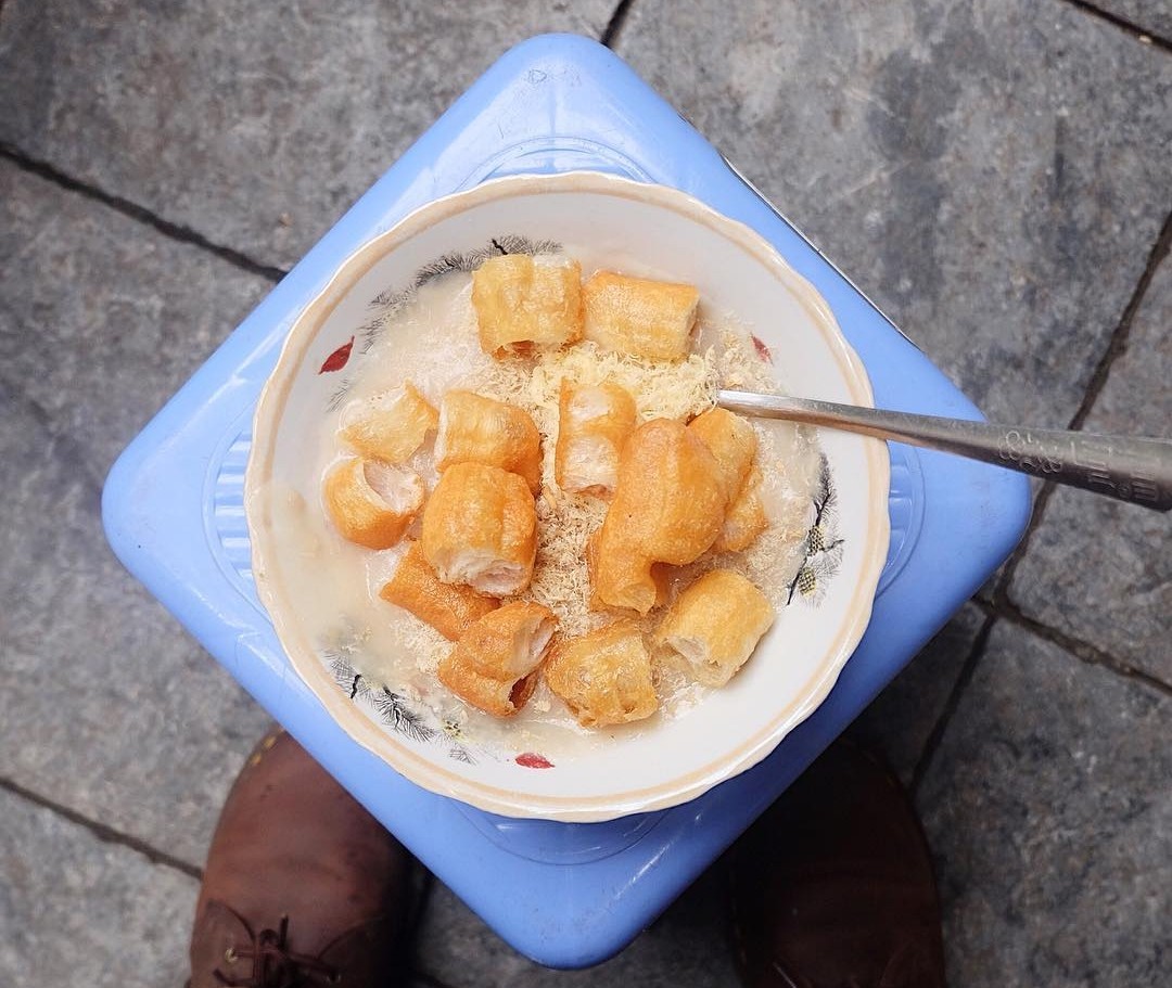 Nếu muốn nạp một thứ gì đó cho chiếc bụng nhẹ nhàng, bạn có thể tìm đến quán cháo sườn lâu đời trên phố Hàng Bồ. Quán chẳng có gì cầu kỳ khi chỉ với chiếc thúng nhỏ cuốn vải dày để giữ cháo nóng hổi, giỏ đựng hộp, giấy, thìa, bát, rổ quẩy thêm vài lọ gia vị xếp gọn gàng. Chỉ thế thôi mà quán lại đông đúc lạ thường. Cao điểm nhất là tầm 7h-7h30 sáng.