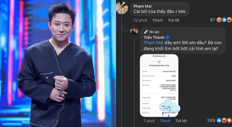 Trên trang cá nhân, MC Trấn Thành cũng thông báo ủng hộ 500 triệu đồng tới UBMT Tổ quốc Việt Nam TPHCM và kêu gọi mọi người chung tay giúp đỡ đồng bào miền Trung vượt qua khó khăn do mưa lũ. Đáng chú ý, trong bài đăng thông báo của Trấn Thành, một tài khoản bất ngờ để lại bình luận đòi xem "bill". Thay vì im lặng, nam MC lập tức phản hồi bằng thái độ thẳng thắn. Trấn Thành đính kèm ảnh chuyển khoản số tiền 500 triệu đồng và nhắn gửi ngay dưới bình luận: "Đây em! Bill em đâu? Bà con đang khổ! Em bớt bớt cái tính em lại!".