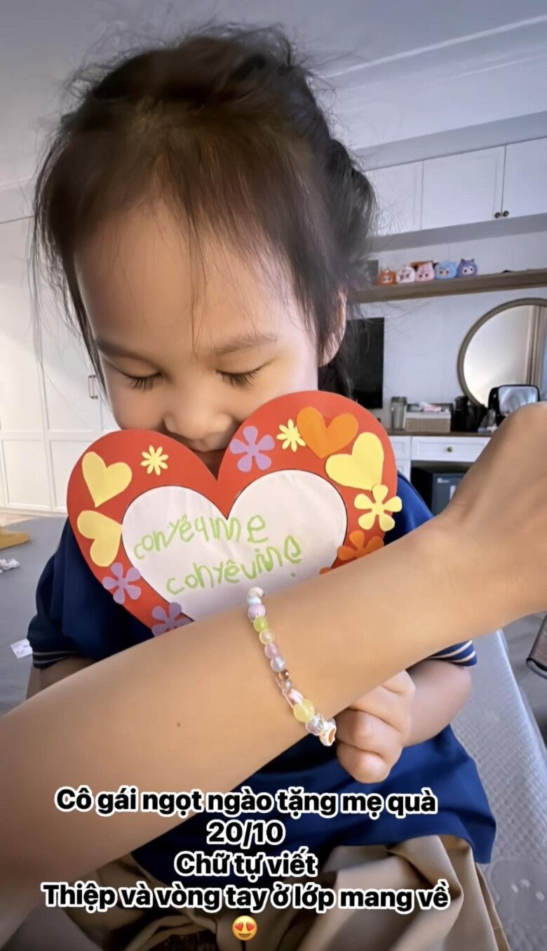 Bảo Thanh hạnh phúc khi con gái 4 tuổi đã tự tay làm được món quà đầu tiên để tặng mẹ ngày 20/10: “Món quà tuyệt vời nhất mà em bé Nu 4 tuổi tặng mẹ nhân ngày 20/10. Biết bao áp lực, mệt mỏi của mẹ đều tan biến hết khi mẹ được ôm em vào lòng!!! Những dòng chữ đầu tiên em viết cũng là ‘Con Yêu Mẹ’... sao mẹ hạnh phúc quá!”.