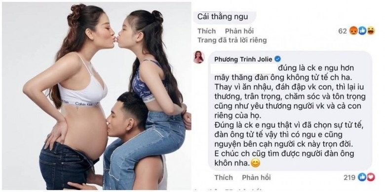 Mới đây, Phương Trinh Jolie gây chú ý khi khoe bộ ảnh bầu bí cùng Lý Bình. Trước hình ảnh hạnh phúc của gia đình nữ diễn viên, đa số mọi người đều để lại lời chúc phúc. Tuy nhiên, có một cư dân mạng đã để lại bình luận chửi mắng rằng: "Cái thằng ngu".