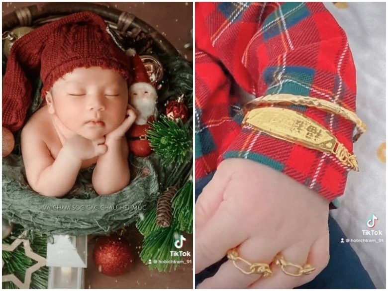 Đặc biệt, khoảnh khắc quý tử tay chân đeo vàng, không chỉ một mà là rất nhiều vàng khiến nhiều người chú ý. Đây đều là những món quà do người thân tặng cậu bé nhân dịp đầy tháng ít ngày trước, đến nay mới được Hồ Bích Trâm chia sẻ khiến dân tình ai nấy cũng trầm trồ. Cùng đoạn clip, Hồ Bích Trâm còn hài hước viết: "Trụ cột sau này để Mẹ Châm dựa vào".