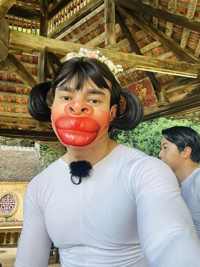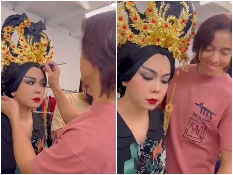 Việt Hương viết: “Cảm ơn anh đã vẽ tóc đuôi rùa cho hoàn chỉnh phần hóa trang lên sân khấu. Hôm qua trong lúc diễn đã lật móng nhưng hiện đã ổn, cảm ơn cả nhà yêu thương. Và để đội đầu Thái hậu khoảng 3 kí thì chân tóc nó đỏ và rụng hết phần chịu sức nặng. Vậy mà không thấy đau”.