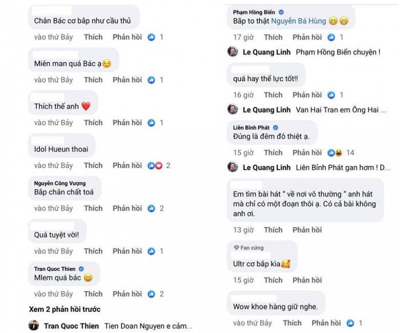 Dưới bài viết, nhiều bạn bè và người hâm mộ vào để lại lời khen đến cơ bắp khỏe mạnh của anh. Liên Bỉnh Phát cũng phải thốt lên “Đêm đô thiệt”, còn Quốc Thiên thì thể hiện thái độ ngưỡng mộ với đàn anh bằng dòng bày tỏ “Mlem quá bác”.