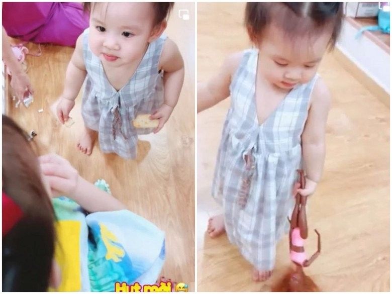 Trong clip, cô út nhà Vy Oanh gây chú ý nhất vì những hành động rất đáng yêu. Ngoài ra, cô bé Mio còn khiến mọi người “cười xỉu” với cách chơi búp bê có phần “bạo lực”.