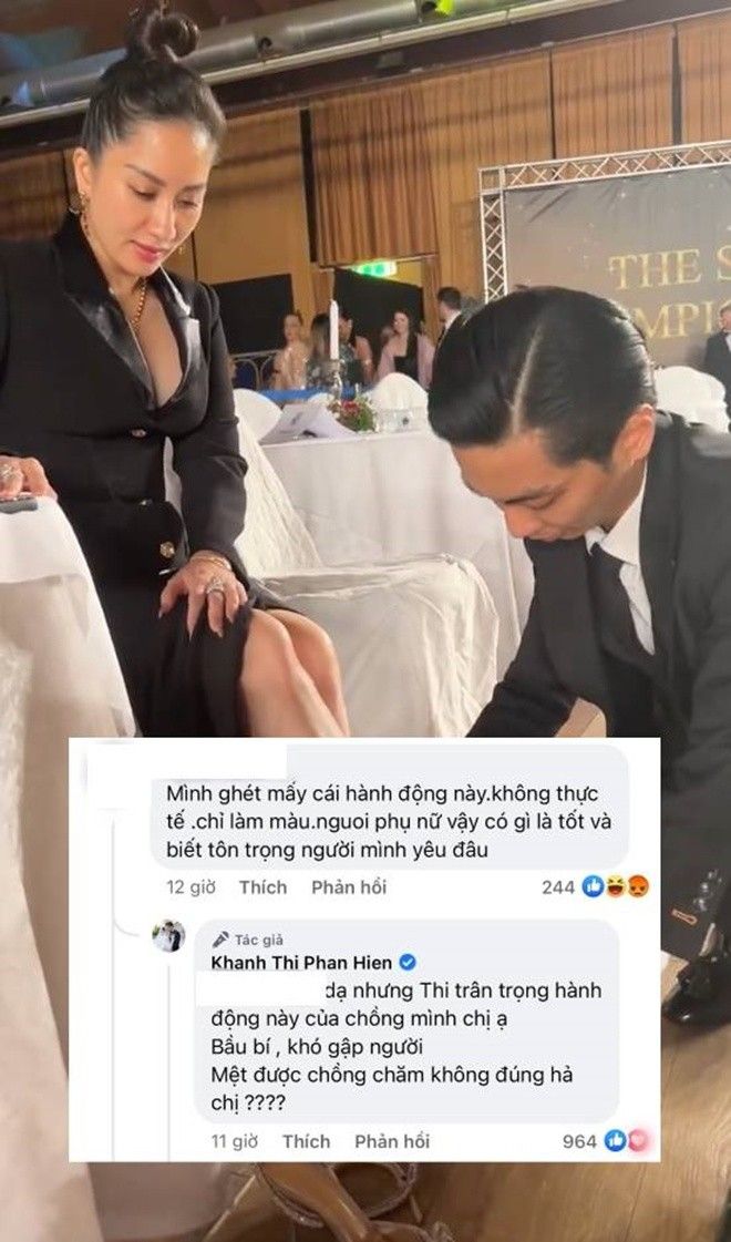 Dưới bài viết, nhiều người bày tỏ sự ngưỡng mộ đối với 2 vợ chồng nhưng cũng có một số cư dân mạng cho rằng cặp đôi đang làm màu. Ngay sau đó, Khánh Thi lên tiếng đáp trả anti-fan. Cô cho biết mình trân trọng những hành động chăm sóc của chồng khi vợ mang bầu. Người đẹp "nguyện diễn vai hài làm màu này cả đời".