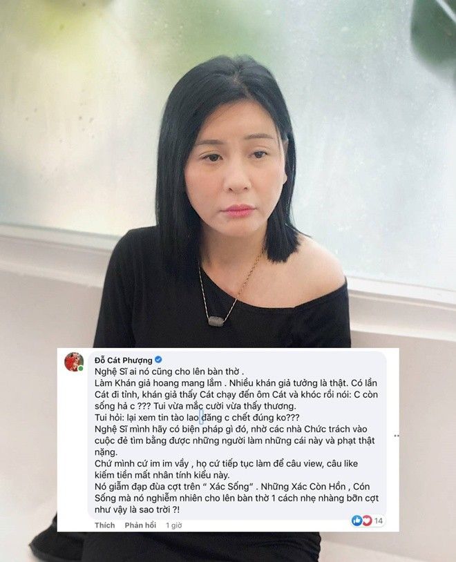 Trong một bài viết gần đây, MC Đại Nghĩa đã chia sẻ tình huống oái oăm khi hình ảnh của mình bị cắt ghép, bịa đặt thông tin Đại Nghĩa qua đời để "câu view", "câu like". Trước tin đồn vô căn cứ, nghệ sĩ Cát Phượng bức xúc thể hiện thái độ vì cô cũng từng là nạn nhân của việc này: "Nghệ sĩ ai nó cũng cho lên bàn thờ làm khán giả hoang mang lắm. Nhiều khán giả tưởng là thật. Có lần Cát đi tỉnh, khán giả thấy Cát chạy đến ôm Cát và khóc rồi nói: Chị còn sống hả chị? Tôi vừa mắc cười vừa thấy thương. Tôi hỏi: Lại xem tin tào lao đăng chị chết đúng không?