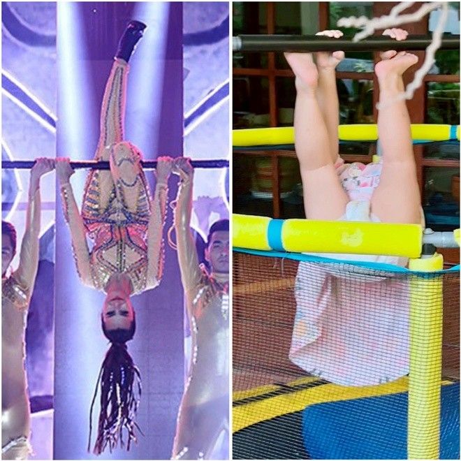 Trên trang cá nhân, cả Đông Nhi và chồng đều chia sẻ loạt khoảnh khắc vui chơi thoải mái của con gái. Trong ảnh, bé Winnie được mẹ cho diện váy hoa nữ tính, tóc buộc 2 chùm điệu đà. Tuy nhiên, thay vì những trò chơi nhẹ nhàng, nữ tính, nhóc tỳ lại có màn đu xà chuyên nghiệp. Chứng kiến con gái có hành động bá đạo, Đông Nhi liền than thở: "Bây giờ mới hiểu vì sao các mẹ hay bảo 'đẻ con gái cho thùy mị'”.