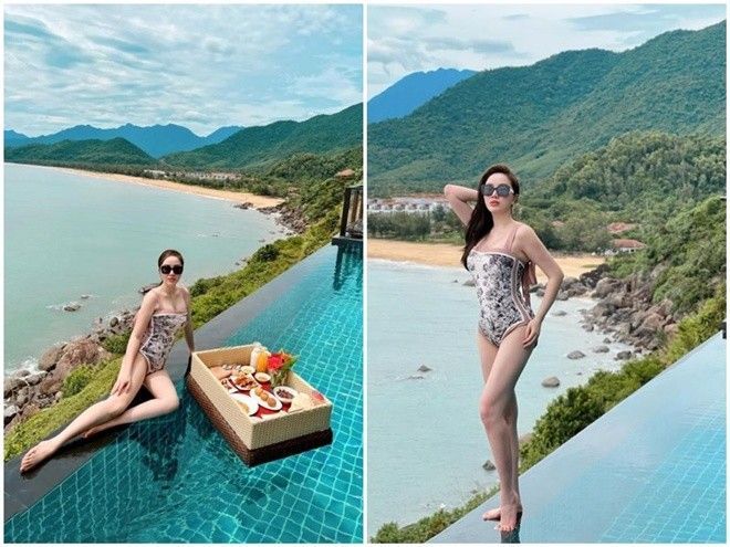 Thời gian gần đây, Bảo Thy khiến nhiều người ngưỡng mộ khi thường xuyên có những chuyến du lịch sang chảnh. Mới nhất, nữ ca sĩ tiếp tục tung loạt ảnh thả dáng với áo tắm siêu hot bên bể bơi. Trong bộ đồ ôm sát cơ thể, "mẹ bỉm" nổi tiếng khoe body chuẩn chỉnh, vòng nào ra vòng nấy.