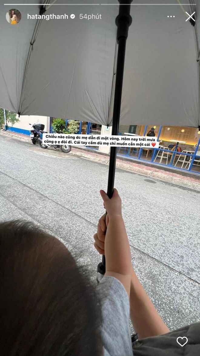 Trên trang cá nhân của mình, nàng dâu hào môn Tăng Thanh Hà vừa khoe ảnh đưa con trai đi dạo. "Ngọc nữ" cho biết đây là thói quen của con vì chiều nào cũng được mẹ cho đi 1 vòng. Nữ diễn viên còn "tan chảy" trước hành động đáng yêu của bé Mason: "Chiều nào cũng được mẹ dẫn đi 1 vòng. Trưa nay trời mưa cũng ọ ẹ đòi. Cái tay cầm dù mẹ chỉ muốn cắn cho 1 cái".