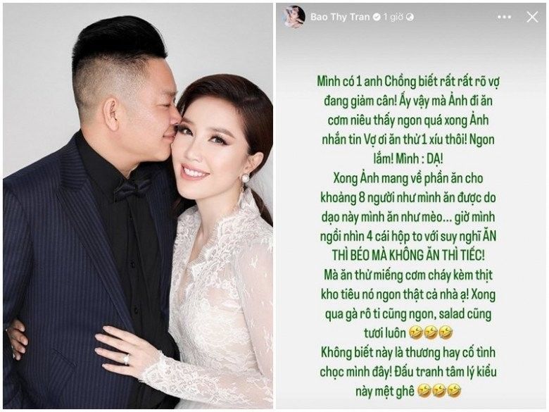 Mới đây, Bảo Thy kể câu chuyện "dở khóc dở cười" về ông xã đại gia khiến người hâm mộ thích thú. Nữ ca sĩ viết: "Mình có một anh chồng biết rất rõ vợ đang giảm cân! Ấy vậy mà ảnh đi ăn cơm niêu thấy ngon quá xong ảnh nhắn tin: 'Vợ ơi ăn thử một xíu thôi! Ngon lắm!'. Mình: 'Dạ!', xong ảnh mang về phần ăn cho khoảng 8 người như mình ăn được do dạo này mình ăn như mèo...