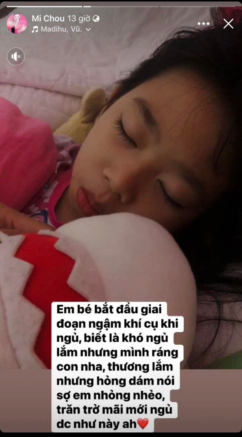Ngoài ra, trên trang cá nhân, cô bảo mẫu cũng cho biết Lavie đang niềng răng, phải ngậm khí cụ để ngủ. "Em bé bắt đầu giai đoạn ngậm khí cụ khi ngủ, biết là khó ngủ lắm nhưng ráng nha con. Thương lắm nhưng không dám nói sợ con nhõng nhẽo. Trăn trở mãi mới ngủ được như này", cô viết.