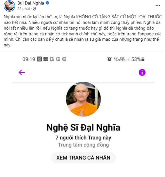 Mới đây, MC Đại Nghĩa một lần nữa lên tiếng đính chính thông tin anh tặng thuốc miễn phí cho bà con là giả mạo khiến nhiều người bức xúc thay. Theo nam MC chia sẻ thì đây không phải lần đầu nên anh phải lên tiếng cảnh cáo ngay lập tức: “Nghĩa xin nhắc lại lần thứ… n, là Nghĩa không có tặng bất cứ loại thuốc nào hết nha. Nhiều người cứ nhắn tin hỏi hoài làm mình cũng thấy phiền. Nghĩa đã nói rất nhiều lần rồi, nếu Nghĩa có tặng thuốc hay gì đó thì Nghĩa đã thông báo rộng rãi trên trang cá nhân có tick xanh chính chủ này, hoặc trên trang fanpage của mình. Chỉ cần các bạn để ý chút là sẽ nhận ra sự giả mạo của những trang như thế này.”